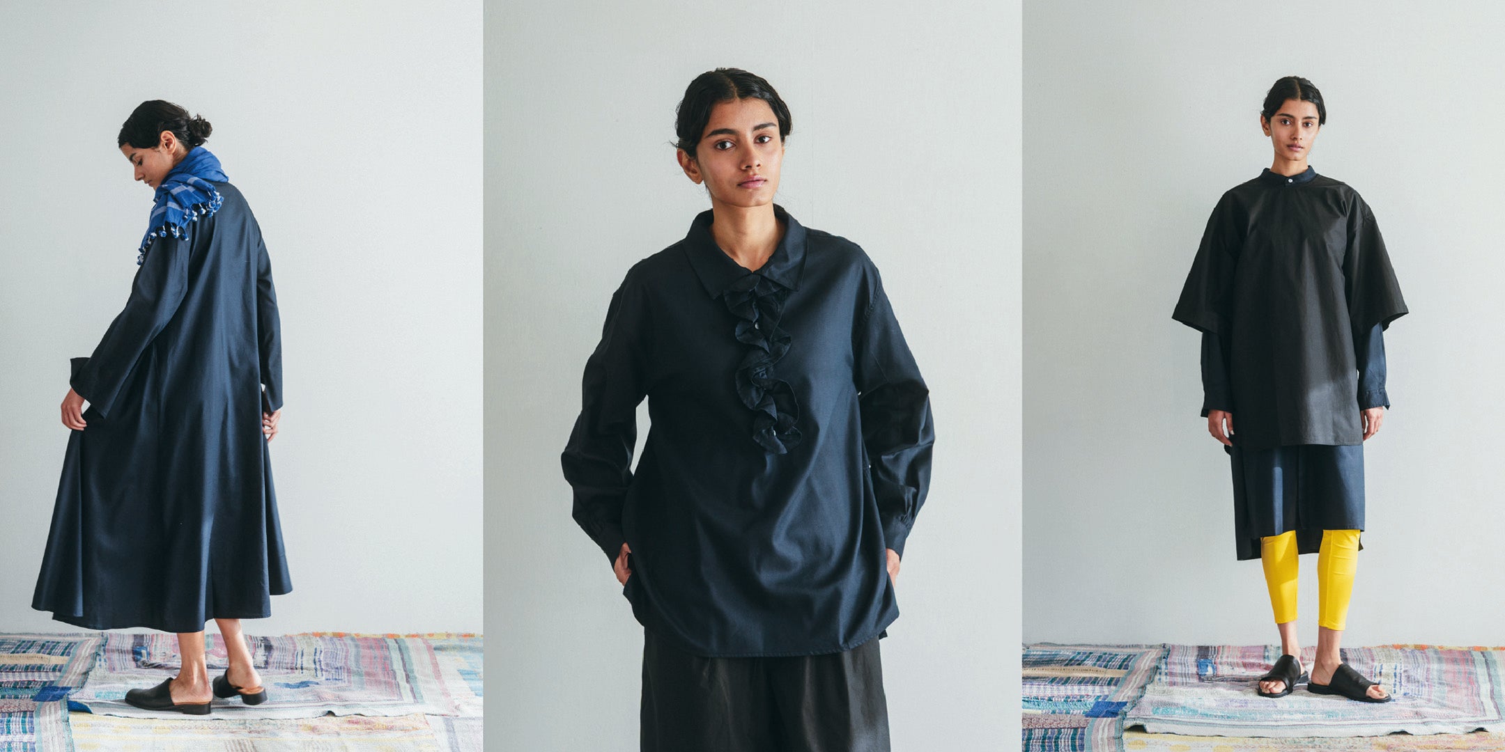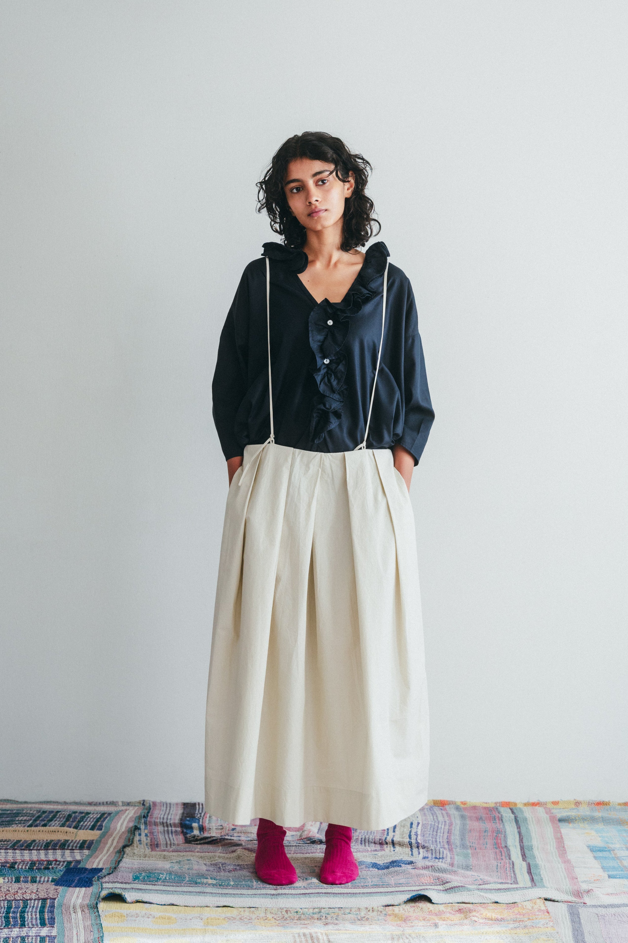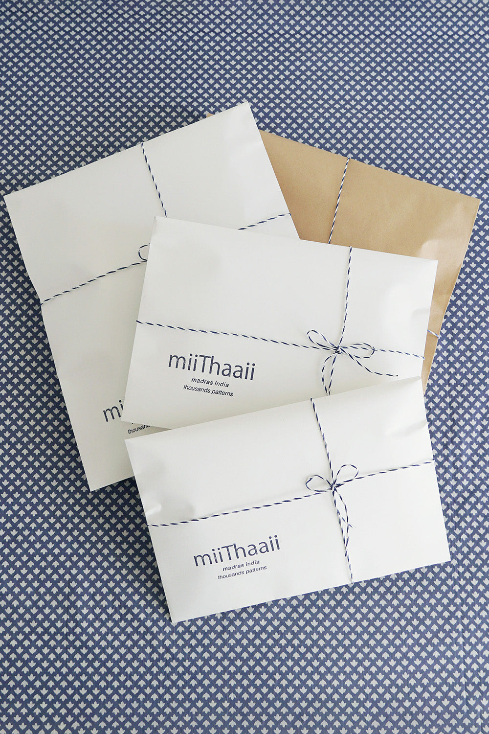 miiThaaiiというのはヒンディ語で『お菓子』という意味。fog linen workが本業だとしたらmiiThaaiiはちょっとした遊びのつもりと思って、始めたブランドなのです。行き当たりばったりで、インドの各地を旅するにつれ、さまざまな人や布、ものとの出会いもあり、扱う素材も増えてきました。生地そのものの販売をはじめ、衣類やバッグ、スカーフ、インテリアファブリックなど手仕事の温もりや力が感じられるアイテムを展開しています。